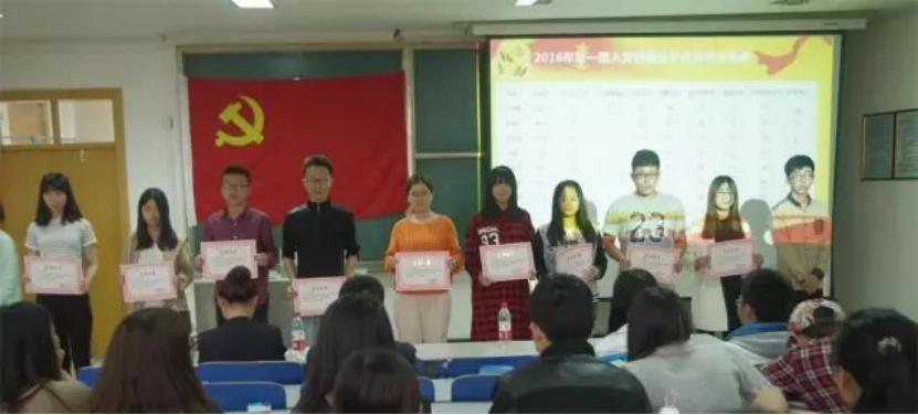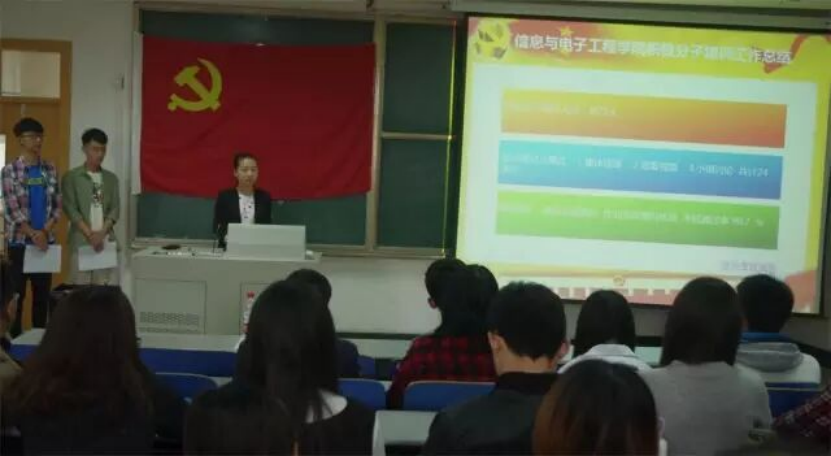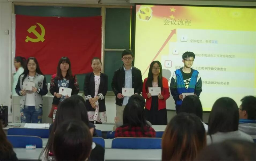 出席党课结业仪式的嘉宾有信息与电子工程学院学生党支部书记王丹怡老师,学生党支部副书记孙磊师哥。仪式第一项为全体起立奏唱国歌,仪式第二项是由王丹怡老师对本期培训工作做工作总结发言并公示各个学员考核成绩,仪式第三项由优秀学员代表王志鸿同学做交流发言,仪式第四项由王丹怡老师为5位入党积极分子代表颁发结业证书并合影留念,仪式第五项则由孙磊师哥为入党积极分子培训班的十位优秀成员颁发荣誉证书。党课结业典礼至此圆满结束。